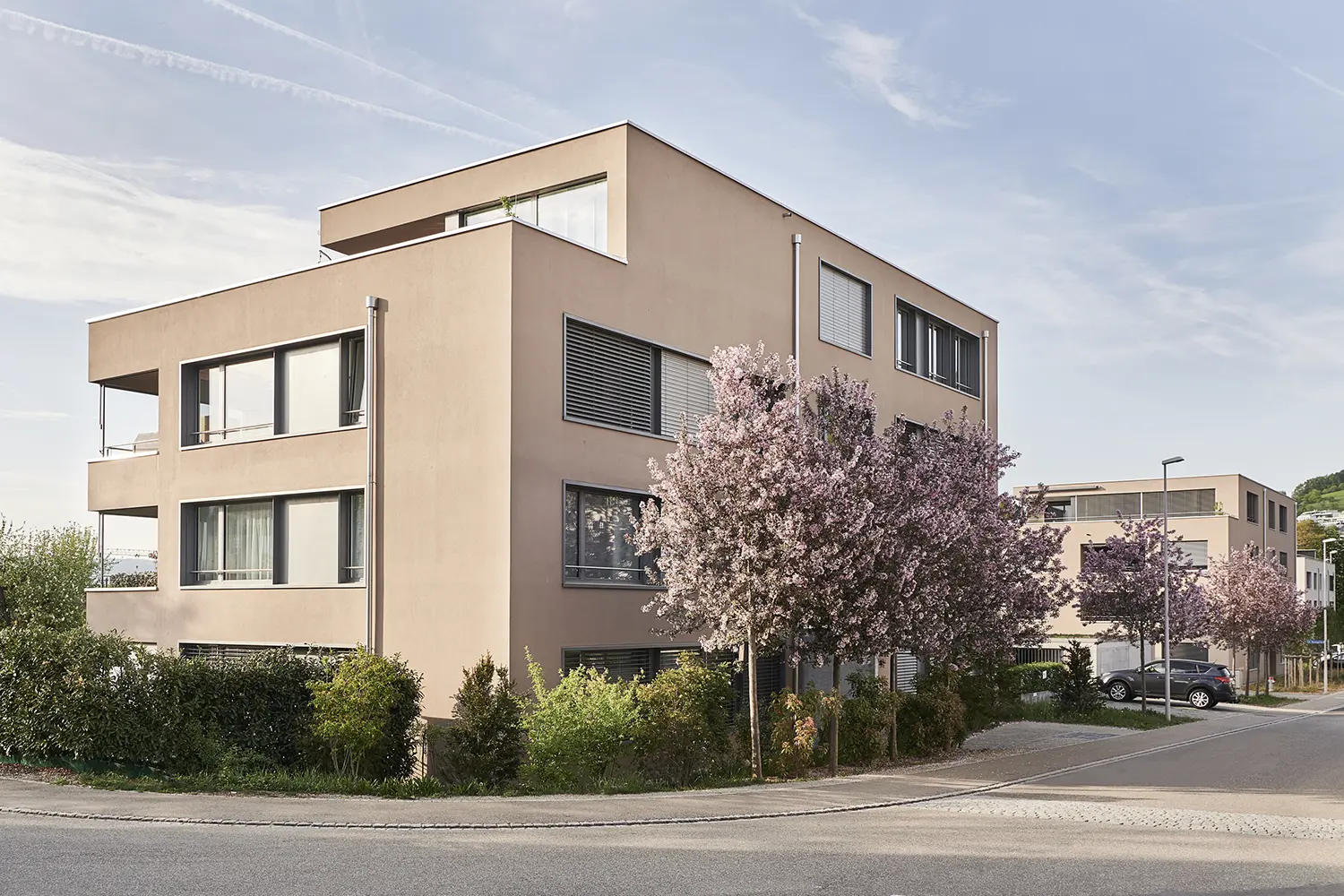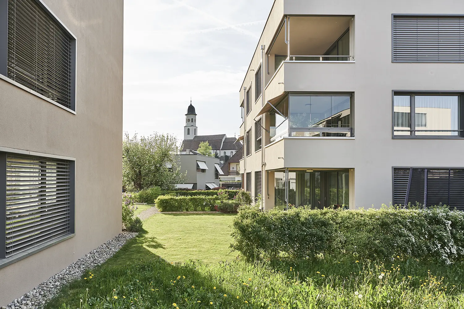 In einem ruhigen Wohnquartier in Frick entstand die Arealüberbauung Im Baumgarten mit 14 Eigentumswohnungen in zwei Gebäuden. Die Übereck-Stellung schafft hochwertige Freiräume, während freigestellte Fassaden allen Wohnungen grosszügige Ausblicke ermöglichen.