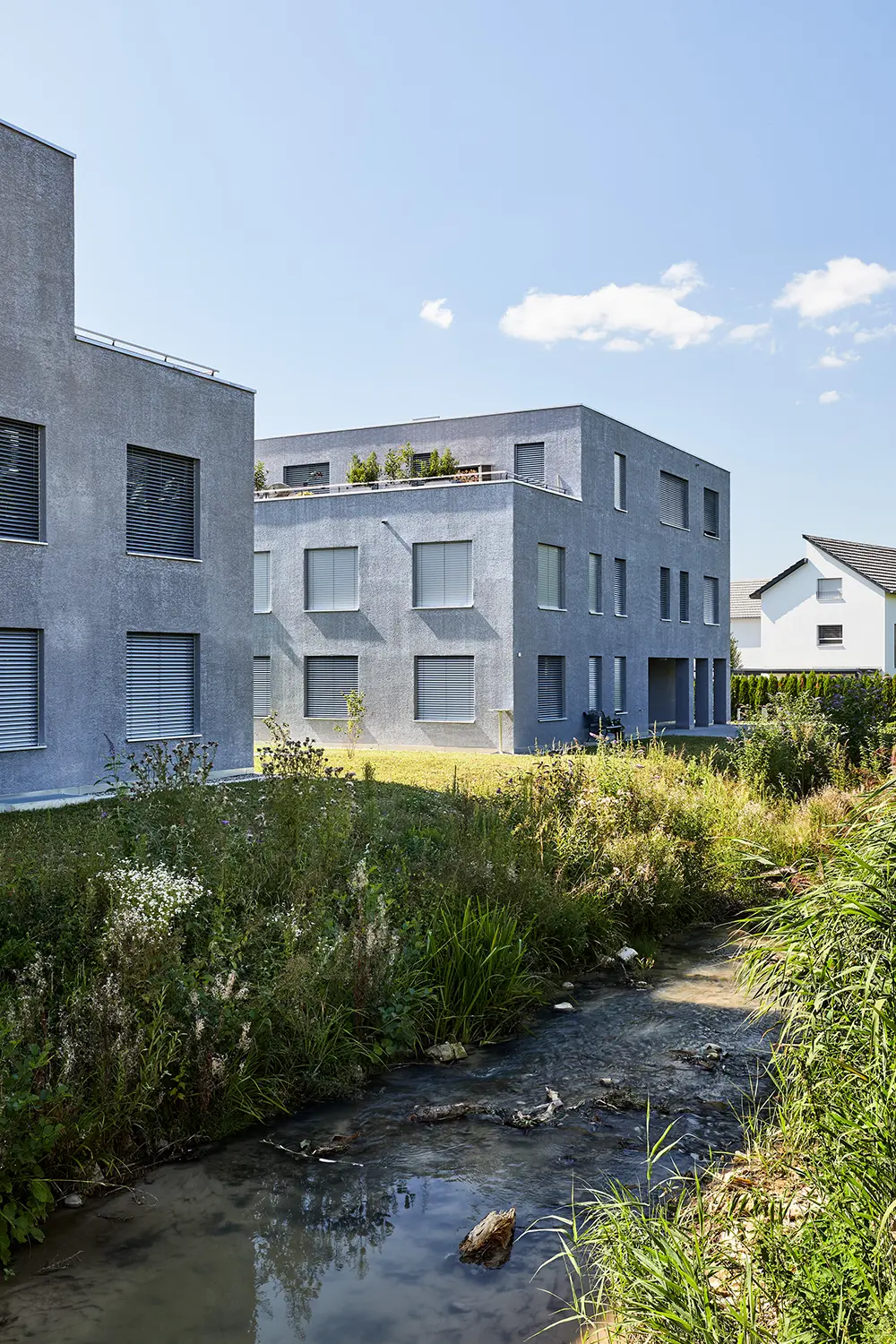 Auf dem Areal der ehemaligen Fischzucht Hohler entstand mit der Wohnüberbauung Bim Mühlirad ein harmonisches Wohnensemble mit hochwertiger Architektur. Nach Südwesten ausgerichtete Wohnungen, grosszügige Aussenräume und der renaturierte Bach prägen die hohe Wohn- und Aufenthaltsqualität.