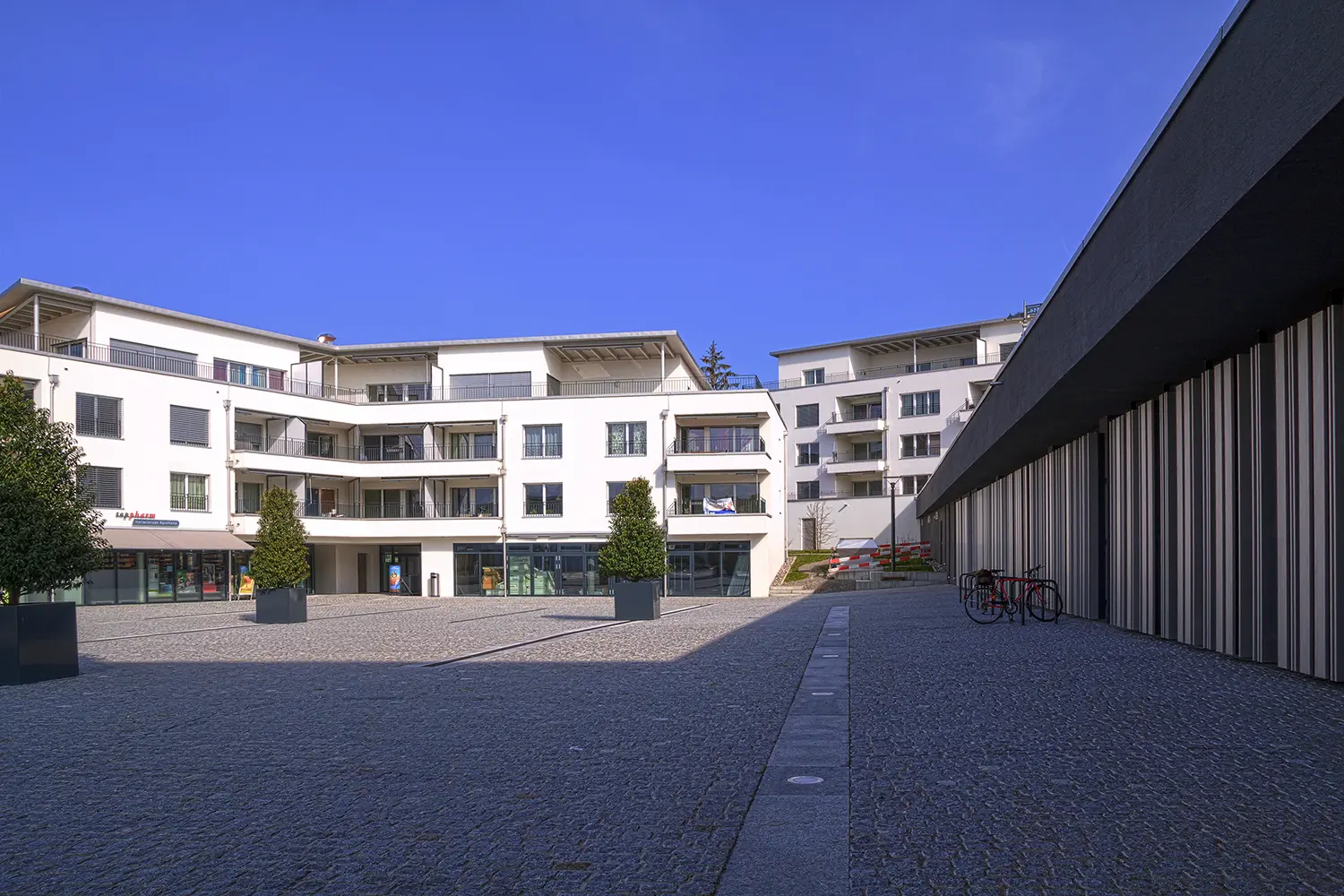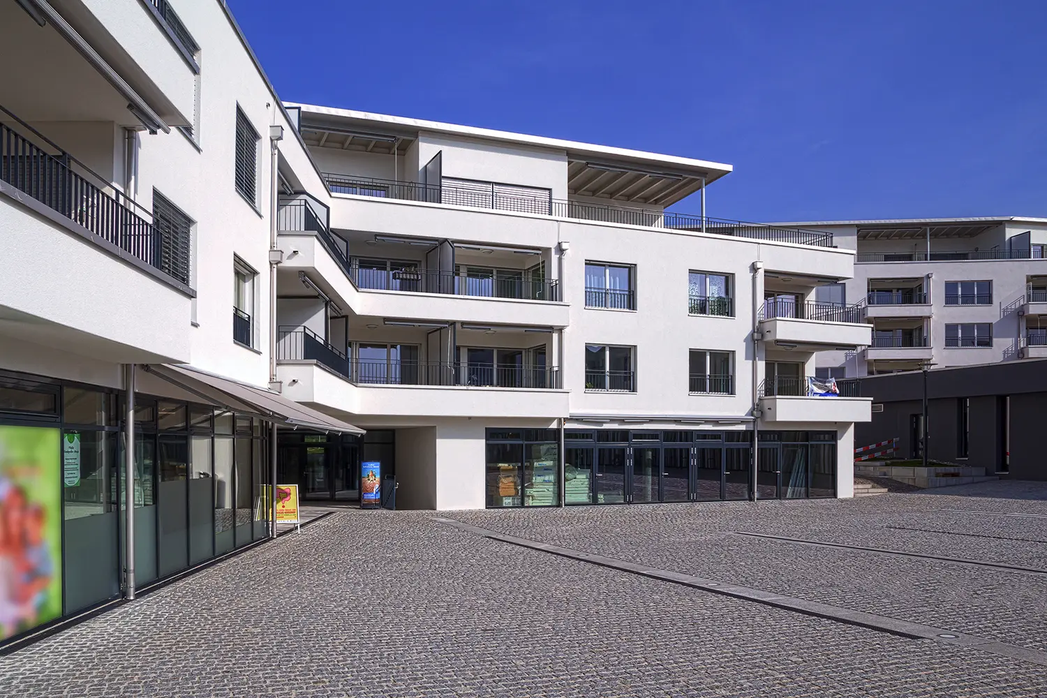 Das vierte Gebäude am Nordost-Rand des Dorfplatzes ist ganz auf altersgerechtes Wohnen (rund 40 Wohnungen) ausgelegt. Die gute Nutzermischung lässt vielseitige Synergien zu. Architektonisch fügt sich das Dorfzentrum mit vergleichsweise geringer Gebäudehöhe und zahlreichen Grünräumen in die bauliche Umgebung ein und durch eine moderne und städtebaulich durchdachte Architektur wird die Zentrumsfunktion hervorgerufen.