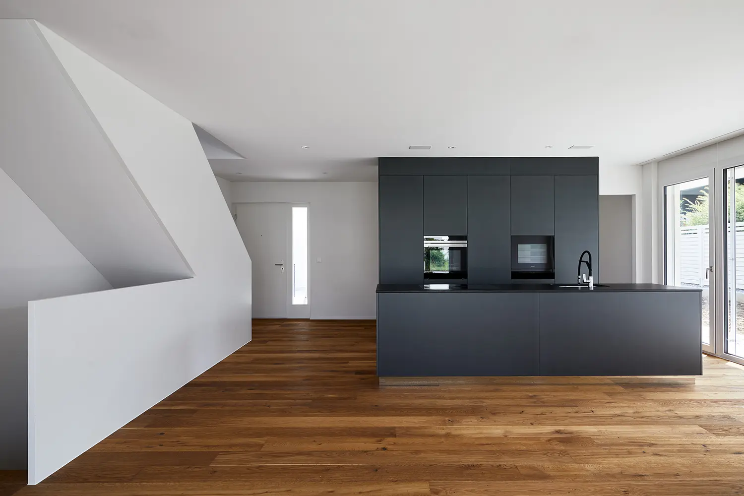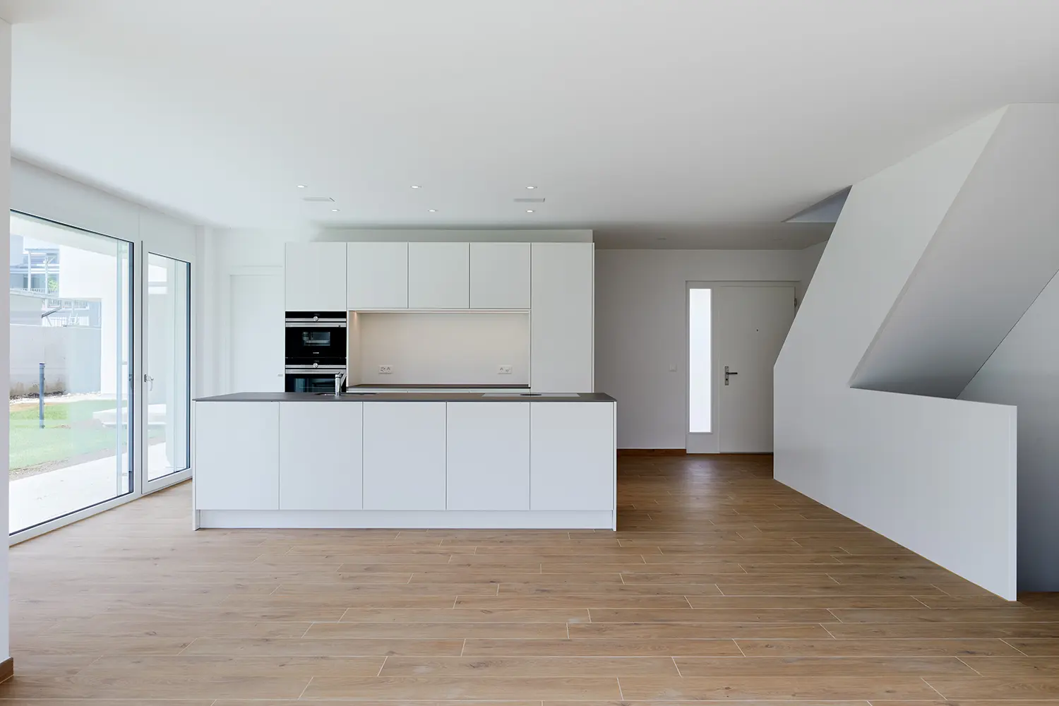 Direkt neben der Kirche entstanden in Wallbach neun freistehende, moderne Einfamilienhäuser. Verbunden sind die Einfamilienhäuser durch eine gemeinsame Einstellhalle. Dadurch ist die gesamte Umgebungs- und Gartenfläche verkehrsfrei, was eine hohe Erholungsqualität und Privatsphäre bietet. Die Einfamilienhäuser weisen eine Wohnfläche von 167 m² bis 172 m² auf und verfügen über einen grosszügigen Keller. Es wurden die neusten Technologien eingesetzt. Die Haustechnik-Integralsysteme bieten die attraktive und kompakte 4-in-1-Lösung, liefert ganzjährig Wohnkomfort und vereinen dabei die zentralen Haustechnik-Funktionen wie Lüften, Heizen, Warmwasserbereitung und Kühlen. Jedes Haus hat eine eigene Photovoltaikanlage (Indachsystem) für ökologische Stromerzeugung installiert. Das Gebäude ist so ausgerichtet, dass durch die grossen Fensterfronten die Sonneneinstrahlung mitgenutzt wird und dadurch der Energieverbrauch für heizen reduziert werden kann. Durch die Pultdachform ergibt sich eine ideale Besonnung der PV-Anlage und erzeugt dadurch auch grosse, lichtdurchflutete Räume im Obergeschoss, welche eine Raumhöhe bis zu 3.70 m aufweisen.