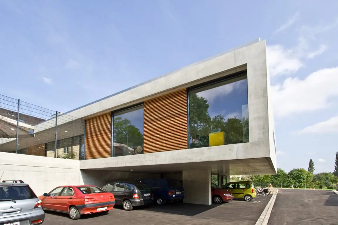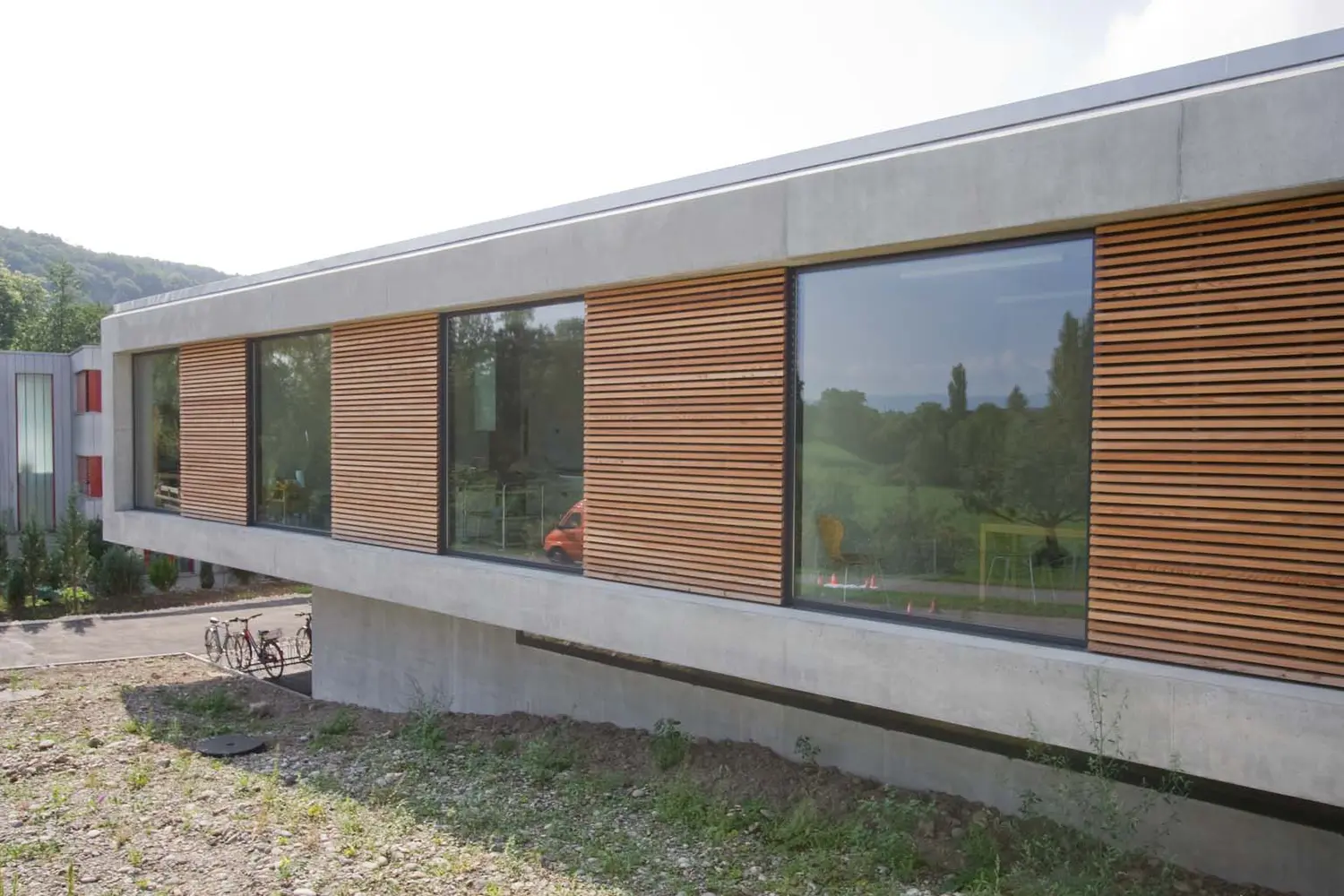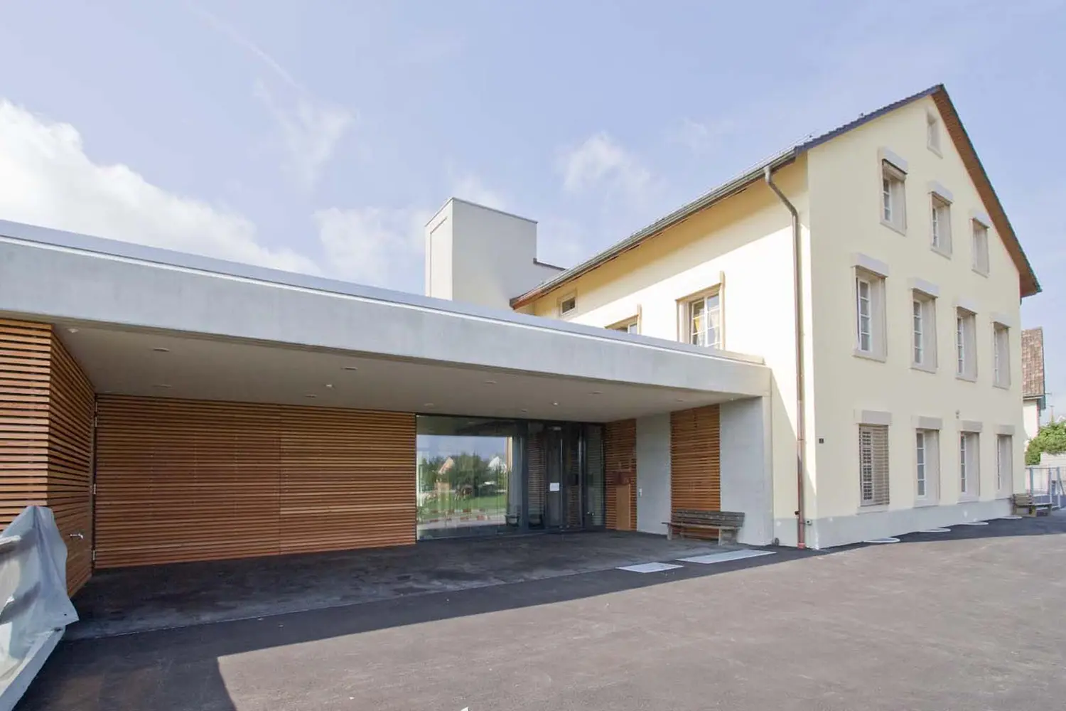 Das bestehende Schulhaus wurde mit einem einfachen, im Gelände eingeschossig erkennbaren, Volumen ergänzt. Durch die Queranbindung des Neubaus wird die Parzelle klar in eine Pausenhof- und eine Zugangsseite gegliedert. Der Aussenbereich erfährt eine Abschirmung zum Verkehr. Im Eingangsbereich wird durch grosse Verglasungen eine starke Transparenz zwischen Ankommen und Aussenraum geschaffen. Die gesamte Anlage wird von den Materialien Beton, Glas, Stein und Holz dominiert.