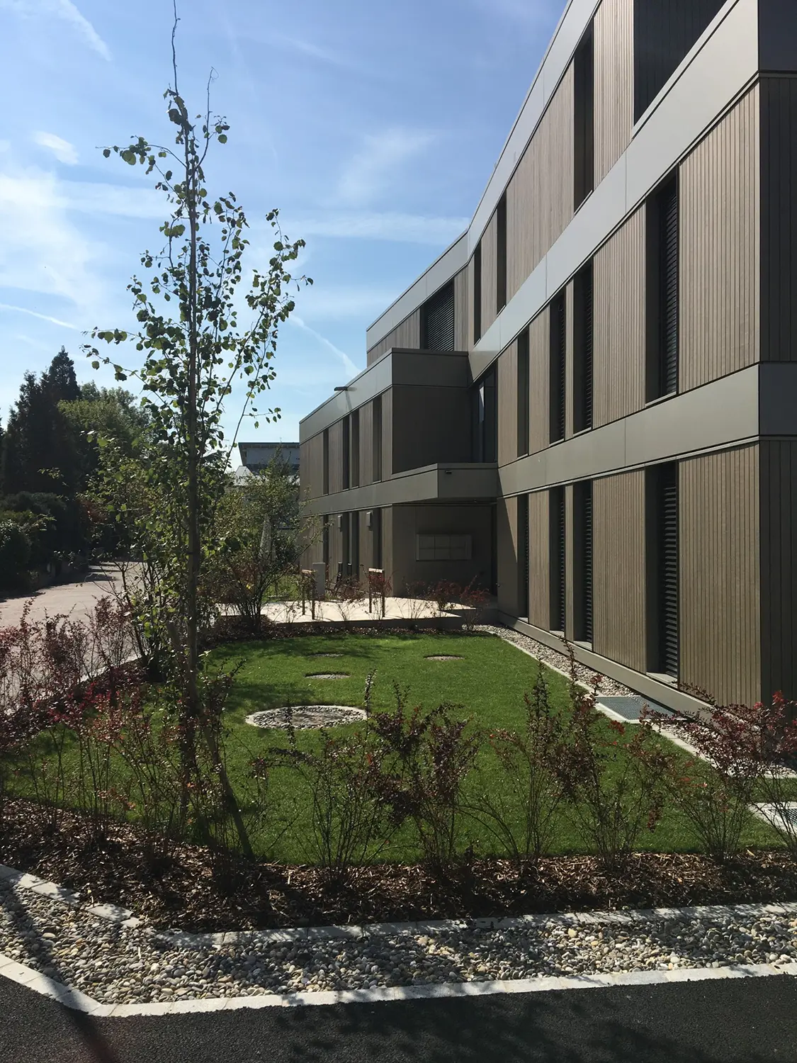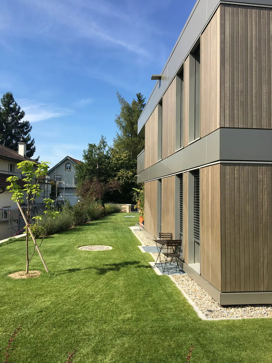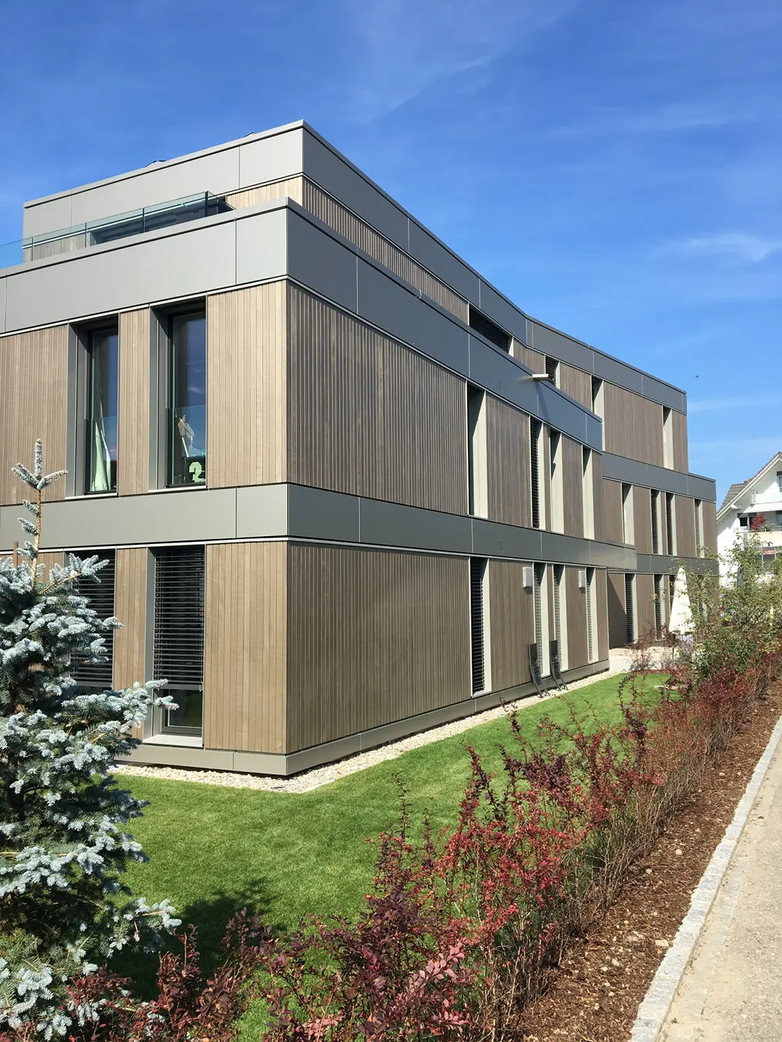 Das Mehrfamilienhaus ist ausgestattet mit natürlich belichteten Nasszellen, komfortablen Eingangsbereichen und schönen Aussenflächen. Die Fenster sind in das Fassadenbild integriert und fügen sich selbstverständlich ein. Im Untergeschoss befindet sich eine grosszügige Einstellhalle mit Parkmöglichkeiten für die Bewohner und die Nachbarn zweier angrenzenden Liegenschaften. Der oberirdische Bau ist komplett aus vorgefertigten Holzmodulen erstellt, was eine Verkürzung der Bauzeit erlaubte. Innovatives Projekt mit hohem technischem Standard und moderner Erscheinung. Sorgfältig gestaltete Aussenräume im Gesamtkontext mit zwei angrenzenden Liegenschaften.