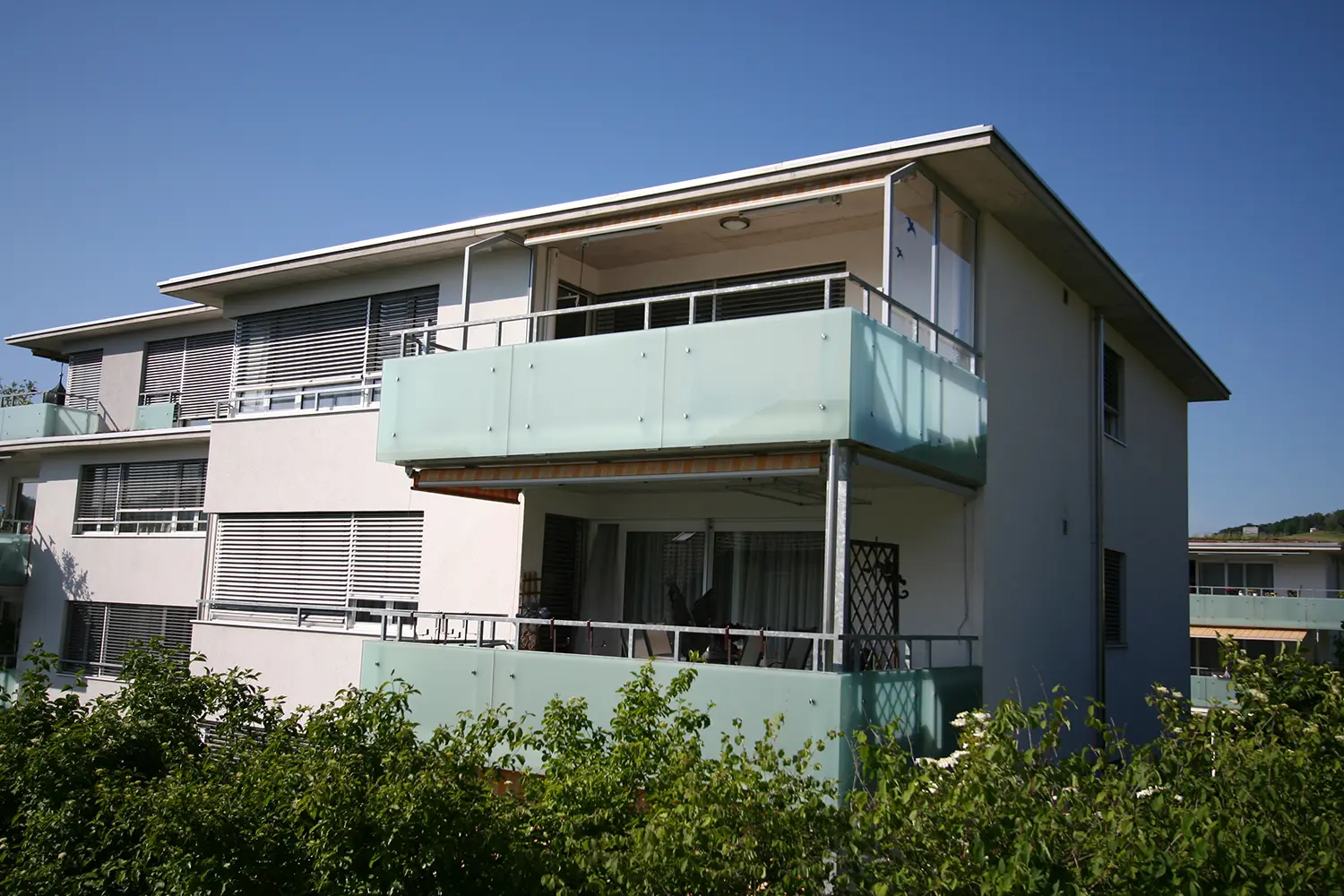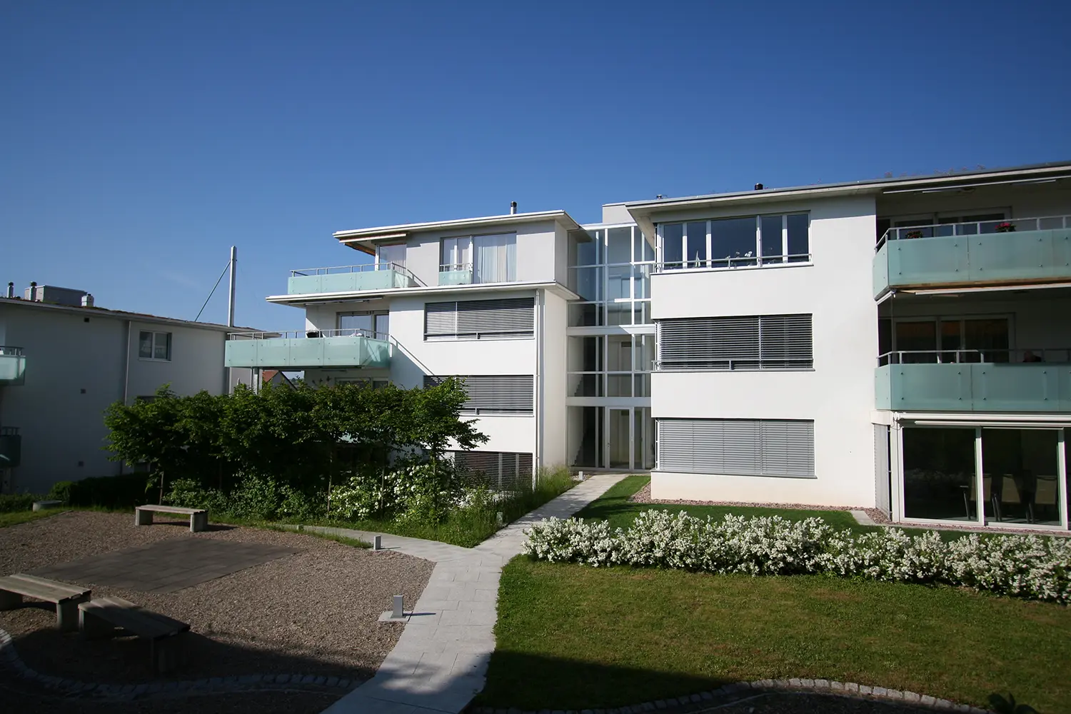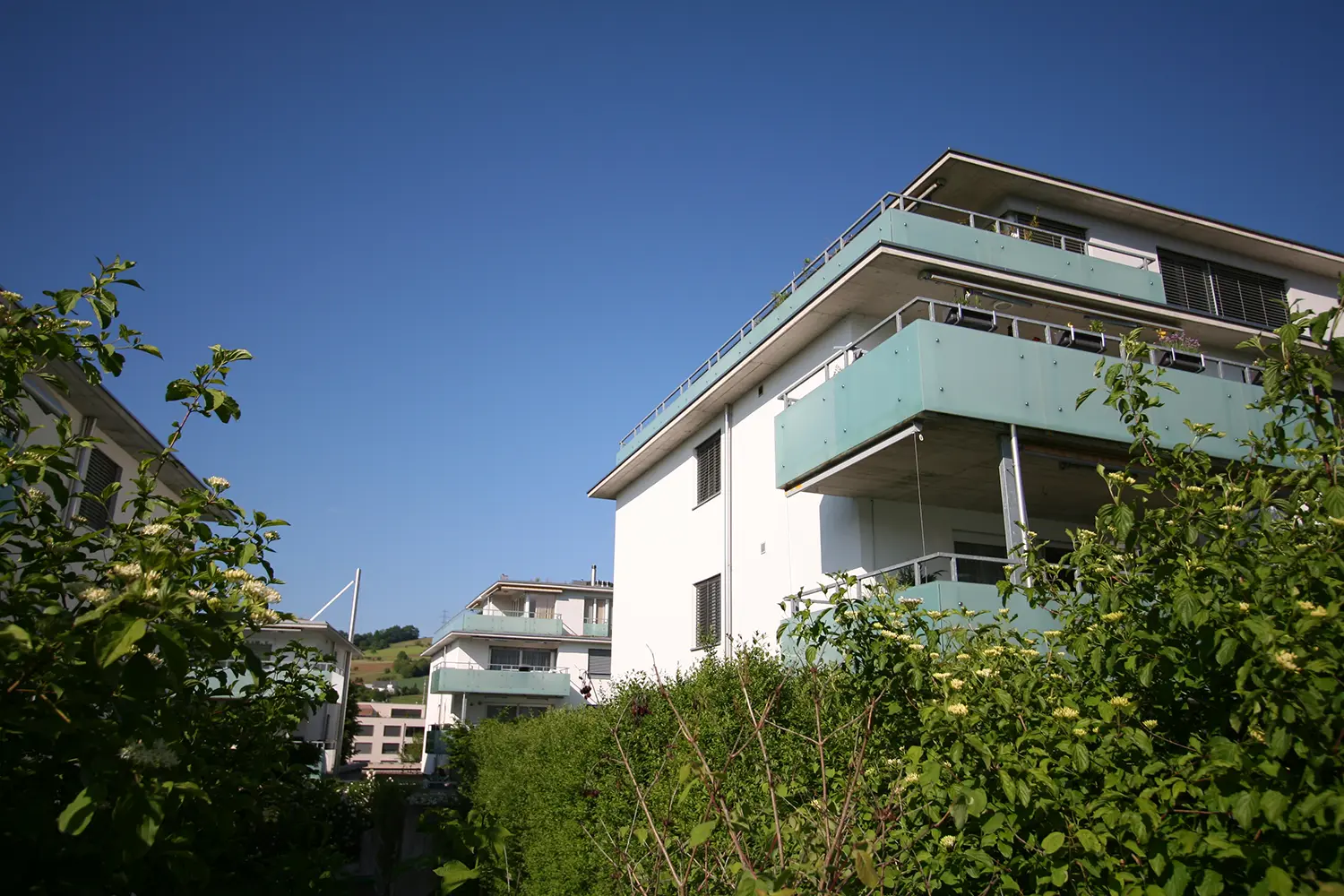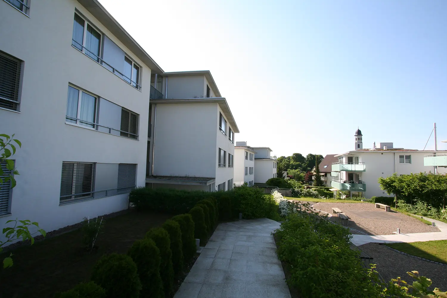 Am Ortseingang von Frick entstanden sechs viergeschossige Mehrfamilienhäuser mit 66 Wohnungen. Durch klare Bauformen, hochwertige Ausstattung, Dachterrassen, Loggias und private Gartenanteile bieten die Überbauung sowie die Untergeschosse mit Einstellhallen und Kellerräumen modernen Wohnkomfort in attraktiver Lage.