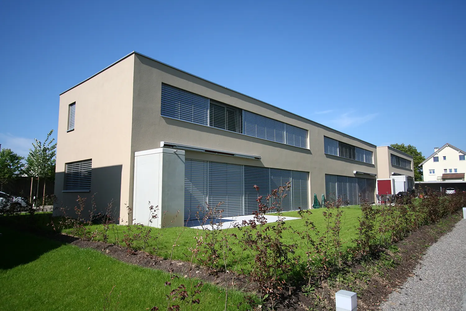 In einem von Einfamilienhäusern geprägten Quartier entstand eine moderne Wohnsiedlung mit 12 Einheiten. Zwei unterschiedliche Haustypen in verkehrsfreier Anordnung schaffen attraktive, familiengerechte Wohnungen mit optimaler Südausrichtung und eigener Parkierung.