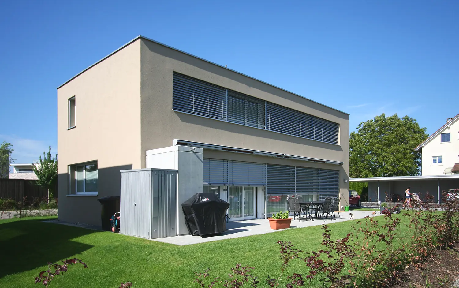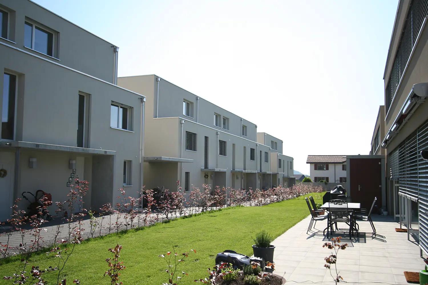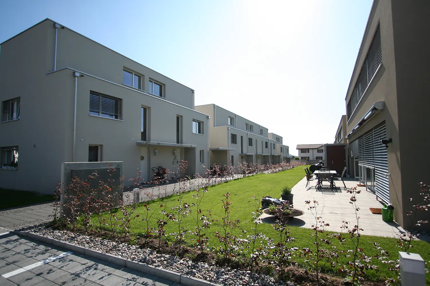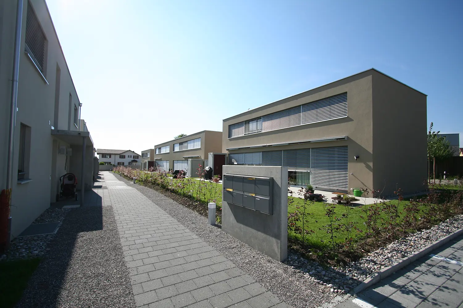 Die verkehrsfreie Wohnbebauung besteht aus zwei Häuserzeilen mit zwei jeweils unterschiedlichen Haustypen. Die zweigeschossigen Solitär-Häuser (Haus Typ A) sind in ihrer längs zur Häuserzeile liegenden Anordnung auf maximale Südausrichtung ausgelegt. Der Haustyp B verfügt über zwei Vollgeschosse und ein Attikageschoss. Dank der Dreigeschossigkeit bietet das Attika-Haus grosszügiges Wohnen auf einer vergleichsweise kompakten Parzellenfläche.